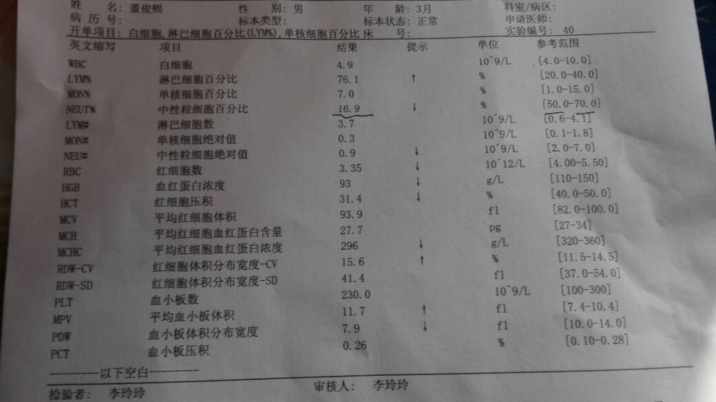 你好,根据检查的情况来看,宝宝的血常规主要是显示出现贫血的情况,此外出现淋巴细胞计数增高,一般这种情况多见于病毒感染,最常见的就是病毒性感冒,若宝宝没有出现明显不适症状的话,可以暂时继续观察一下,定期复查,若出现不适症状的话,则需要根据情况就医检查治疗。