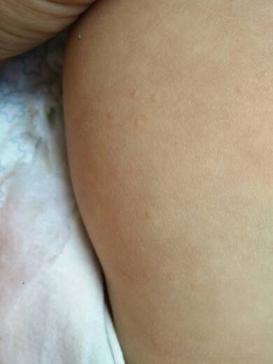 能帮我看看这是什么吗?只有右侧腿上有,右脚脚心还有一个,孩子一切正常 就是肚子咕咕响 谢啦