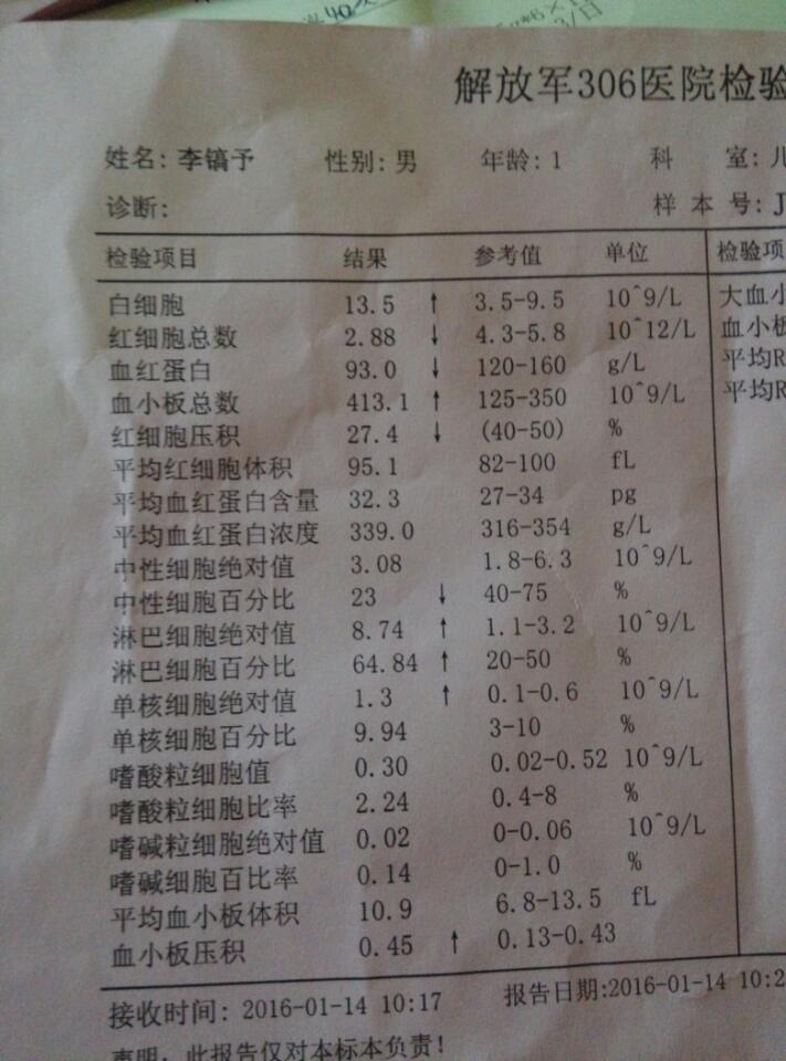 出生41天的宝宝血常规结果是这样,请问是要怎么办?最近宝宝老鼻塞 出生41天的宝宝血常规结果是这样,请问是要怎么办?最近宝宝老鼻塞 点击展开 137*****004_kaDc 2016-01-15 15:57 为您推荐: 其他回答 没事,,, 文栋 2016-01-15 21:31 问问医生, 年大娘 2016-01-15 18:18 问问医生吧 ※天天 2016-01-15 18:01 有炎症了、 冯纫机的麻麻、 2016-01-15 17:19 检查医生没说吗 ≈烟花再美,终究会消失 2016-01-15 17:02 加载更多 相关问题 41天宝宝血常规单子,最近老鼻塞 还未打卡介苗 宝宝5个月了,第一次发烧持续2天了,高烧40度并伴有恶心呕吐腹泻 去医院检查血常规,说是C反应蛋白 宝宝出生100天(男宝宝,15 5斤),最近变得很爱闹!一直吃母乳的,这些天变得不喜欢吃,一喂就哭