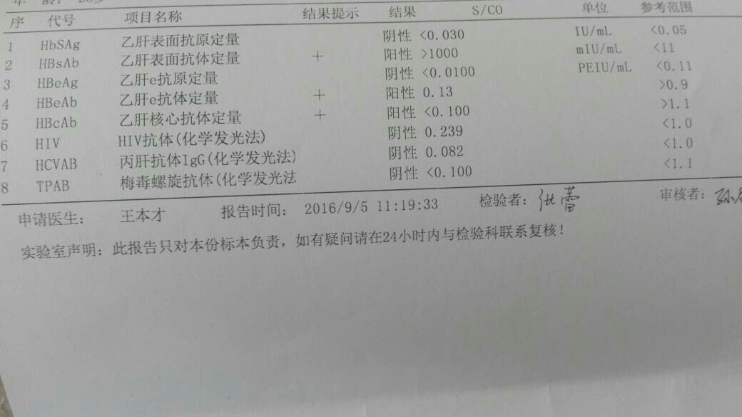 怀孕39周了,做的产前检查,医生说我有乙肝,一会又说没事,没影响,谁帮我看下报告单,真的没事吧&# 怀孕39周了,做的产前检查,医生说我有乙肝,一会又说没事,没影响,谁帮我看下报告单,真的没事吧😌 点击展开 匿名用户 2016-09-05 12:32 满意回答 亲,没事的, 匿名用户 2016-09-05 12:43 宝宝知道提示您:回答为网友贡献,仅供参考。 相关问题 我现在怀孕13周咯刚做完NT检查请问什么时候做胎儿畸形检查阿还有我老公有乙肝对孩子没影响把 我08年检查有乙肝、未吃药治疗过,现在怀孕36周、乙肝两对半145阳性、DAN浓度只给个参考值小于 怀孕39周了 为什么右边腰疼,我有乙肝是不是因为我的乙肝引起的
