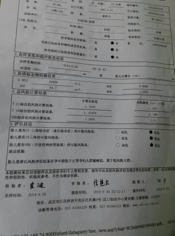 这是我前几天做的唐氏筛查结果,不知道到底有没有问题,市里面没有一位专家医生,都是吃闲饭的瞎掰!自从知道怀孕后这几月心一直没安定下来,就是因为医生少吩咐我一句害得我在怀孕10多天的不知情况下打了5天消炎针,药名:左氧跟磷霉素纳,在第二月得知怀孕后已经太晚了,医生却都见意去打掉不能要,我老公就是家里的独苗,怎么说他都舍不得打掉,当然我也是,就这样我就留下了宝宝现马上四个月了,在这之前,我中间我保过2次胎,心很苦说不出啊,一个人只偷偷的哭,不知该怎么办了,我身体又不好,想再怀个孩子都难,可我更舍不得打掉,只想碰碰运气,。可今天医生说我这种情况要去武汉大医院重检,可我就前几天保胎刚好点,不能坐车该怎办