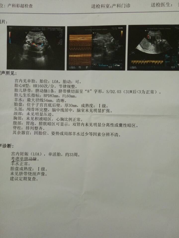 单脐动脉脐带内仅有一条脐动脉,称为“单脐动脉”.单脐动脉的胎儿1/4者伴有心血管畸形,或其他部位畸形,流产,早产,死亡率也明显升高.单胎中,单脐动脉发生率为0.8%,而在双胎中,至少有一浅挡叨胎发生单脐动脉者占5%.单脐动脉可作为室厉粗略估计有无内脏畸形的线索,妊娠合并糖尿病妇女的新生儿,其发生率增加.建议最好定期复查B超以进一步了解胎儿的发育情况.如有问题可筛密以继续和我们联系.
