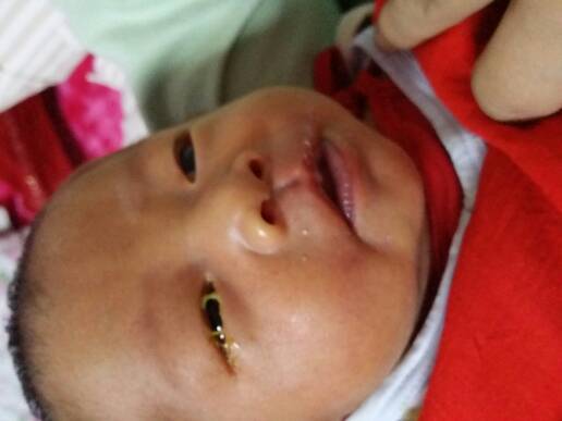 我家宝宝刚出生第二天右眼有白色眼屎,看着有点肿(两只眼睛大小不一样),第三天后眼屎就变成黄色的了现