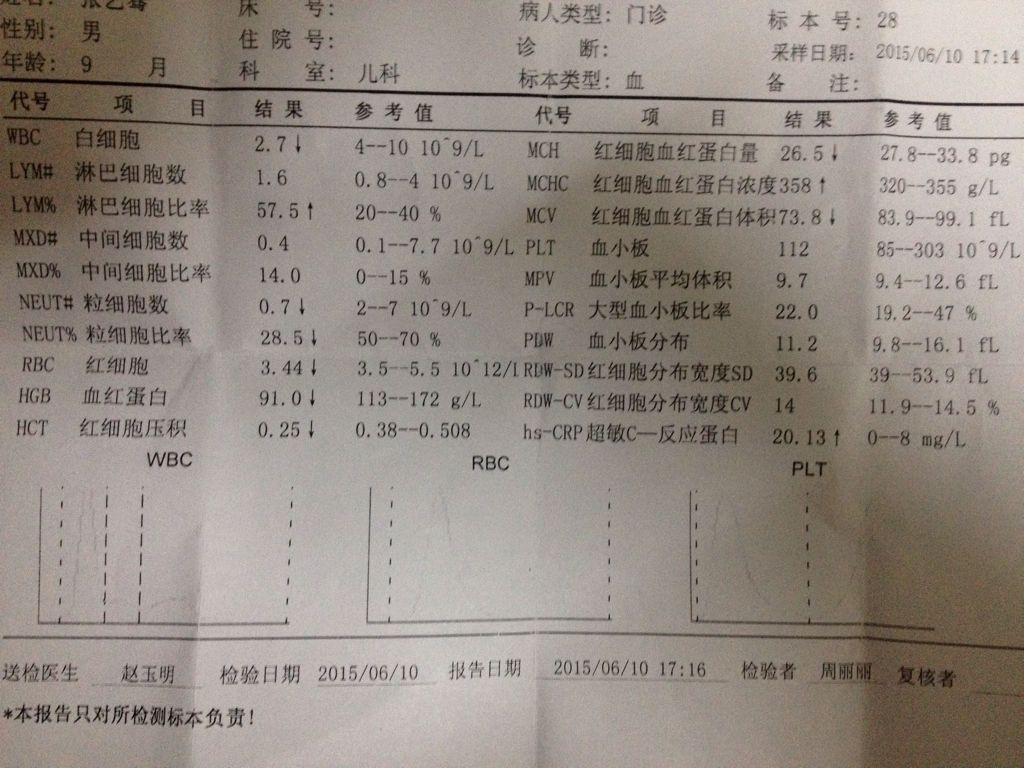 9个月宝宝发烧38左右 这个是血细胞分析报告 求大神指导!怎么用药 刚挂完点滴 阿莫 9个月宝宝发烧38左右 这个是血细胞分析报告 求大神指导!怎么用药 刚挂完点滴 阿莫西林 谢谢 在线等 点击展开 匿名用户 2015-06-10 19:15 满意回答 病毒性感染。夕否侨建议:输液头孢一系类的朗残。就不要吃消炎药了。希望能够采絮今纳 归心慈_jm3k 2015-06-10 19:51 宝宝知道提示您:回答为网友贡献,仅供参考。 为您推荐: 其他回答 你不懂看? 匿名用户 2015-06-10 19:19 相关问题 宝宝发烧39 2,嗓子发炎,查了血项,大夫说是细菌感染,让挂点滴,宝宝太小我不想给她挂点滴,大夫就 宝宝昨天发烧,39 8,去医院打点滴退了,后来今天下午有开始烧,37 9怎么办啊?宝宝是因为断奶两 今天宝宝发烧至40 5打了点滴后现在降到38度,这样的高烧会影响到宝宝的大脑吗?