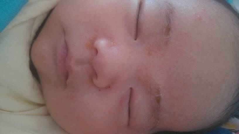 宝宝已过40天了、脸上长湿疹,特别是两眉毛上最严重、还结痂、另外红色上还有白色的小点点、不过看起来