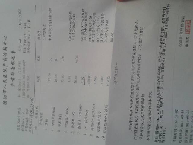 各位亲,谁能帮我看看这个报告,今天拿了唐氏报告被说是高危,其中有一项有点偏高,好担心,医生让做羊水