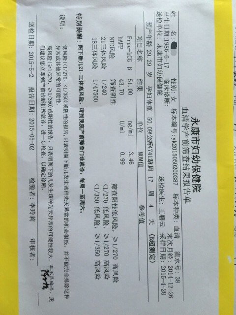 刚拿了唐筛结果,21三体高风险,我该怎么办? 刚拿了唐筛结果,21三体高风险,我该怎么办? 点击展开 158*****478_62Yd 2015-05-03 10:56 为您推荐: 其他回答 你好,根据你的情况是可以做的。 cn#BVBQaLVVVL 2015-05-04 21:26 医生有没有给什么建议 「嗲」~意* 2015-05-03 12:18 做无创了这 胖花花猫 2015-05-03 11:43 一般没事的! ga...0@yeah.net 2015-05-03 11:25 祝你好运, 183*****306_zhXw 2015-05-03 11:08 加载更多 相关问题 唐筛结果21三体风险1、875是不是高风险 唐筛21三体高风险 唐筛结果21三体高风险