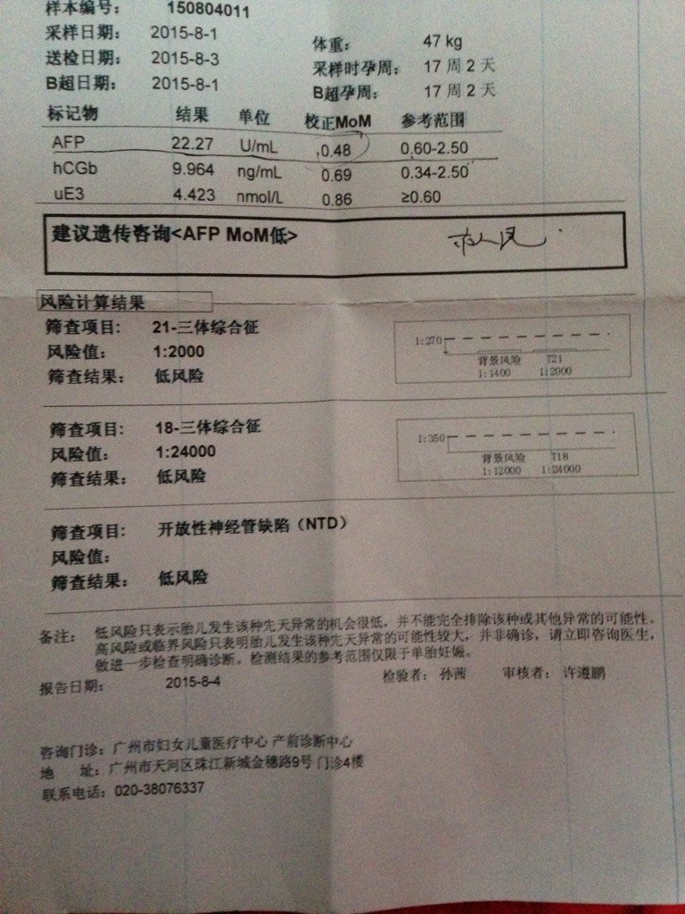 唐氏筛查结果都是低风险,但AFP偏低,严重吗?好担心 唐氏筛查结果都是低风险,但AFP偏低,严重吗?好担心。 点击展开 ″ м е 苏苏° 2015-08-16 16:43 为您推荐: 其他回答 你太担心就去做个无创 555555呜呜 2015-08-16 18:12 祝你好运。 欣 晨 2015-08-16 17:46 不知道。。。。 我的宝宝11.30 2015-08-16 17:31 没事,,, ...yy 2015-08-16 17:26 一般的都是低风险 】幸福壹直存在【 2015-08-16 17:18 加载更多 相关问题 中期唐氏筛查的结果都是低风险,AFP值为 唐氏筛查AFP、hCGb 偏低,低风险 唐氏筛查AFP、hCGb 偏低,低风险
