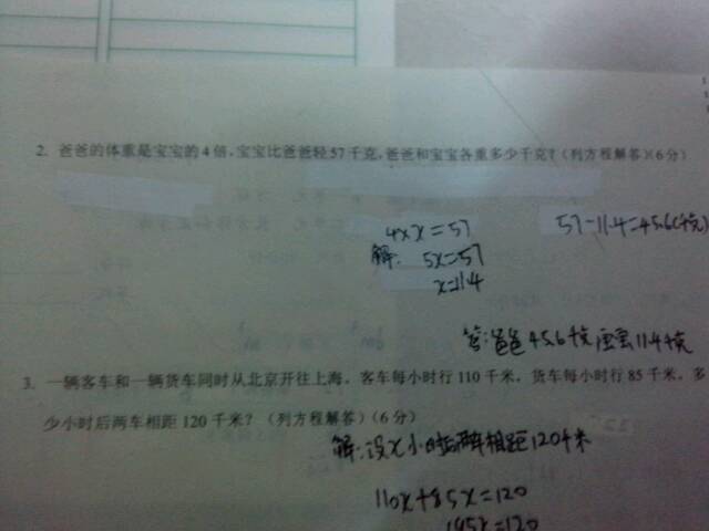 2.爸爸的体重是宝宝的4倍,宝宝比爸爸轻57千克,爸爸和宝宝多重多少千克?(列方程解答)3.一辆客车和一辆货车同时从北京开往上海。客车每小时行110千米,货车每小时行85千米。多少小时后两车相距120千米?(列方程解答)