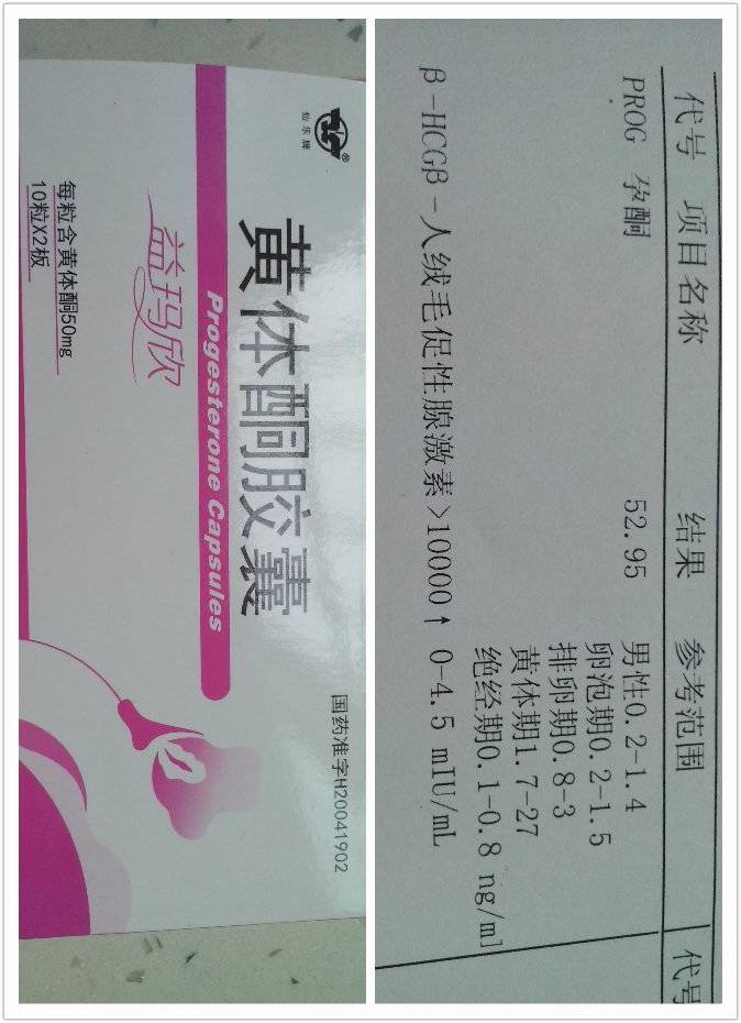 一个星期前检查医生说孕酮低要吃黄体酮胶囊(如图)和打针,打了5天针,6号又去检查(如图),6号刚好是2个月请问医生这个报告单上的孕酮和HCG都正常吗?家里还有一盒黄体酮胶囊医生说让我把它吃完在去医院检查孕酮和查B超,请问我还需要继续吃吗?急急急????