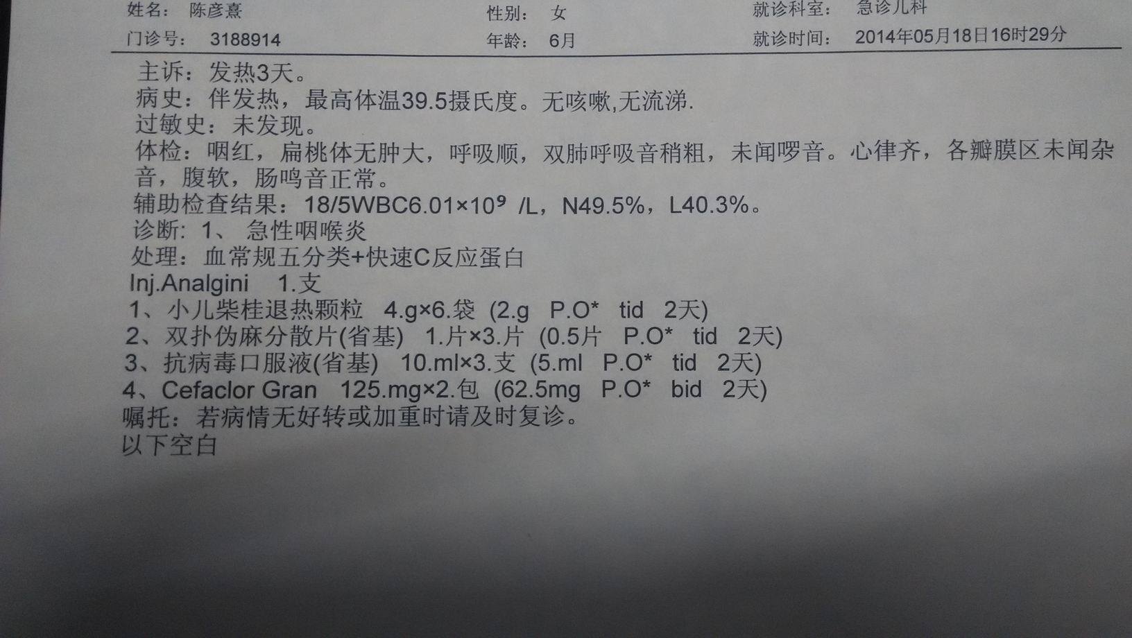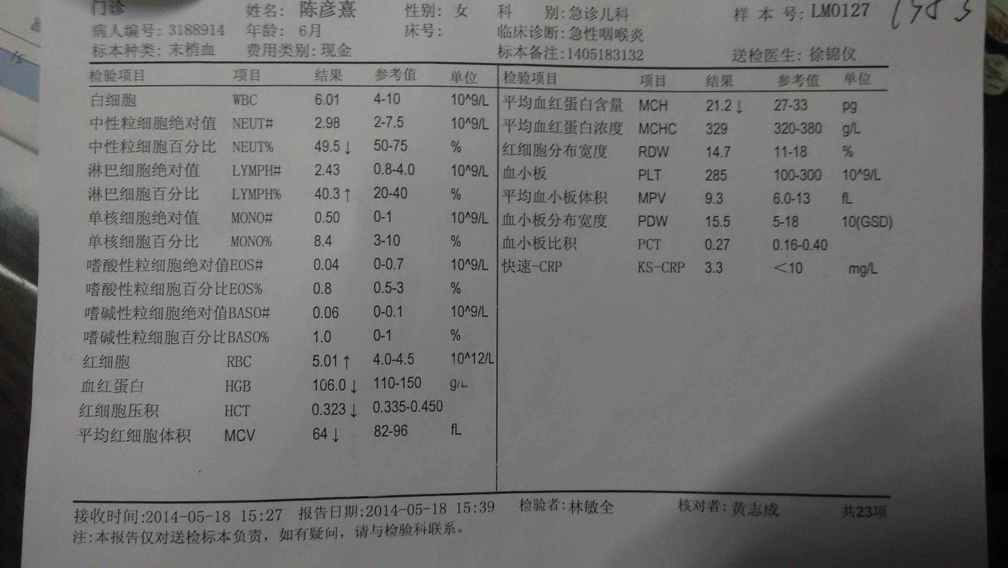 6个月宝宝发烧了,这个血常规报告属于病毒感染还是细菌感染 6个月宝宝发烧3天了,第一天用了退热贴,体温保持在37.8-38.2度,第二天晚上39.2度,喂退烧药降温到37.2度左右,第三天又烧到39.1度。1,去医院检查血常规,忘了医生说是属于病毒性还是细菌感染,麻烦帮我看看。2,如果是细菌感染,要不要喝抗病毒口服液?3,听说这么小就吃抗生素不好啊,如果体温降回37度左右可以不吃吗?谢谢 点击展开 匿名用户 2014-05-18 19:29 为您推荐: 其他回答 病情分析: 你宝宝这种情况,病毒感染和细菌感染都可能。 指导意见: 我看了医生的处方,还不错。要坚持吃,一般体温正常3天以后停药。 匿名用户 2014-05-18 20:25 相关问题 分别血常规病毒感染还是细菌感染 宝宝这两天就是发烧~去医院检查血常规白血球稍微有一点点高~拍x光也看不出来~肺上也没什么~这到底怎 宝宝11个月 4天前发烧前两天一直是37度多到38度5之间沒打针一直在吃药 后两天住院输液血常规检