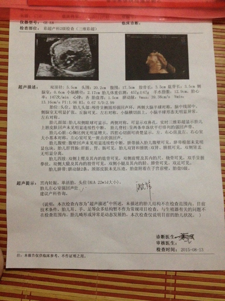 今天刚做的三维彩超+产科2级检查,请医生讲解下报告,左心室强回声灶正常吗?要怎么办? 今天刚做的三维彩超+产科2级检查,请医生讲解下报告,左心室强回声灶正常吗?要怎么办? 点击展开 阿宝。 2015-08-13 21:06 为您推荐: 其他回答 听医生的! 酷宝儿!政洋!政博! 2015-08-14 09:17 问问医生吧 泚籹籽 2015-08-13 23:47 祝宝妈好孕!!! 微^_^爱 2015-08-13 23:31 没事的、别担心 小丸子! 2015-08-13 23:00 后期会好的,,, 什么叫天长地久゜ 2015-08-13 22:49 加载更多 相关问题 有医生在没?有谁知道,胎儿左心室有两枚灶装强回声是怎么回事?求解答 今天做了三维彩超报告结果说有25周+2天的周期,但是实际医生算的周数是24周,怎么回事? 今天去产科医生说我的胎头有点底!这严重吗?要注意什么好