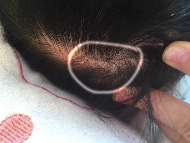 宝贝用手抓,好像很痒的样子!抓下来全身头皮屑一样的东西!!拍的不是很明显,现实里全是白屑 不会是癣