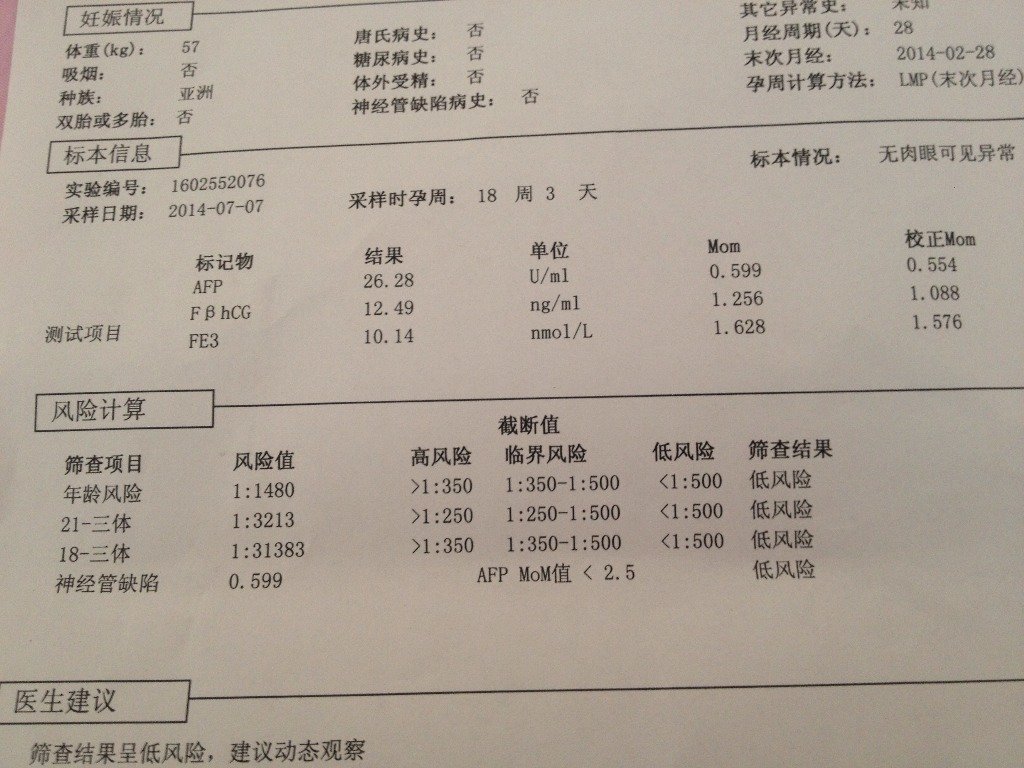 唐筛检查结果,有什么问题吗?回来的急,忘记问医生了 唐筛检查结果,有什么问题吗?回来的急,忘记问医生了。 点击展开 苏小小 2014-07-15 09:31 为您推荐: 其他回答 没问题的,全部都是属于低风险,胎儿患唐氏的风险非常低,不用担心。 贝壳1121 2014-07-15 09:57 没事,都是低风险 娟凤洋 2014-07-15 09:46 相关问题 唐筛是查什么?前几天我去医院检查了,医生提都没跟我提说要检查唐筛