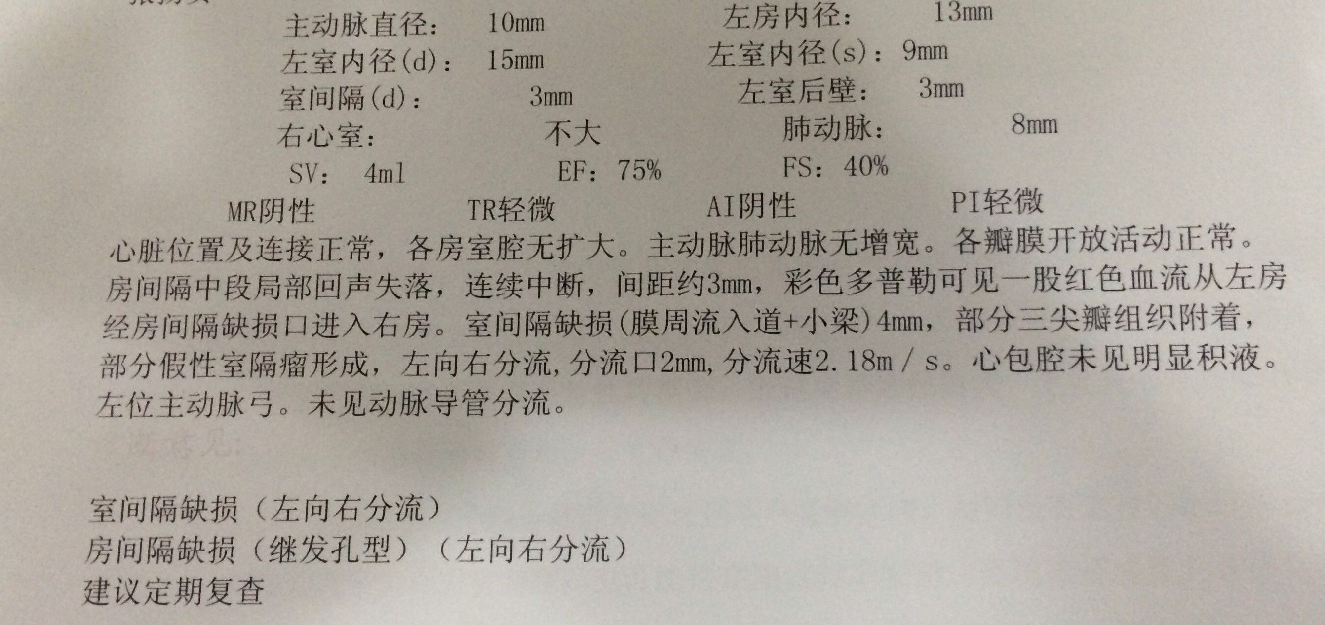 出生4天医生告诉 我 我的宝宝有房间隔缺损和室间隔缺损有没有自愈的可能性!~非常担心在线等答复 点击展开 匿名用户 2014-07-26 01:10 为您推荐: 其他回答 房间隔缺损3mm,室间隔缺损4mm,我个人认为,可以过几个月之后复查,因为宝宝出生后,心脏还是会逐渐生长的,有一些房间隔缺损和室间隔缺损是可以逐渐长好的,包括其他的动脉导管未闭也都是有可能会长好的,所以过几个月再复查看看 taokun830817 2014-07-26 09:24 相关问题 请问有室间隔缺损,房间隔缺损的宝宝没,该怎么办,严重不,能自愈不 你好医生我的宝宝刚出生2天,被查出有脑出血,请问医生这怎么治疗,对宝宝有影响吗?现在她一直哭一直哭 宝宝出生十七天,手上红了一块,以为是胎记,医生说是瘤子,怎么办,做手术痛吗,多大可以去做手术