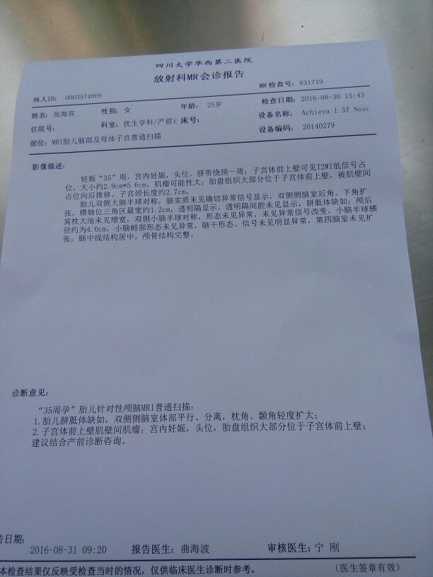 是不是每个胎儿有脑增宽的做磁共振都会有胼胝体缺如? 点击展开 匿名用户 2016-09-02 09:07 满意回答 这个不一定,情况不一定一样, cn#BfGfkpuuGu 2016-09-02 10:28 宝宝知道提示您:回答为网友贡献,仅供参考。 相关问题 我怀孕35周多了,说胎儿左侧侧室宽,医生让做磁共振,报告诊断结果:1 胎儿脑透明腔缺如,胼胝体缺 影像学诊断:胼胝体缺如灰质移位 初发病1年二至三次,有… 3岁男孩走路从2岁左右发现爱翘脚用脚尖走路以为小孩子都有一个阶段这样所以没在意,现在磁共振说胼胝体