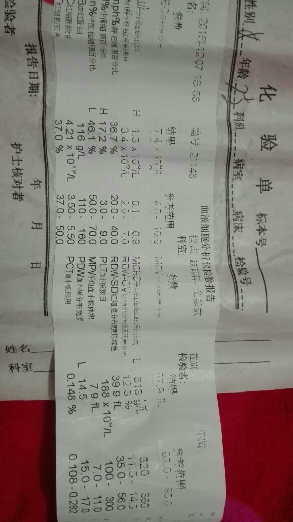 孩子七岁,最近感冒发烧四天了,今天去医院化验了血常规,医生说没什么事,说叫挂点滴,我也看不懂化验单 孩子七岁,最近感冒发烧四天了,今天去医院化验了血常规,医生说没什么事,说叫挂点滴,我也看不懂化验单,谁能看懂帮我看一下,到底是什么引起的发烧。 点击展开 匿名用户 2015-12-07 20:10 推荐回答 病毒感染 用穿心莲制剂 喜炎平或炎琥宁 匿名用户 2015-12-07 20:45 宝宝知道提示您:回答为网友贡献,仅供参考。 为您推荐: 其他回答 冬天发烧寒化热,去找中医师吃些发汗清热药便可。 137*****428_cQHW 2015-12-07 20:21 相关问题 我最近做了血常规化验,化验单下来了,看不明白吧,要怎么样看吧? 血常规化验单哪一些是要着重看的? 呼吸道感染请高手帮我看看血常规的化验单