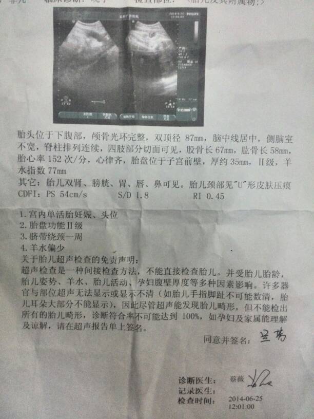 如下图为什么有的医生说正常,有的医生说宝宝颈部见u形皮肤压痕,羊水偏少怕患上综合症建议剖腹,但我想