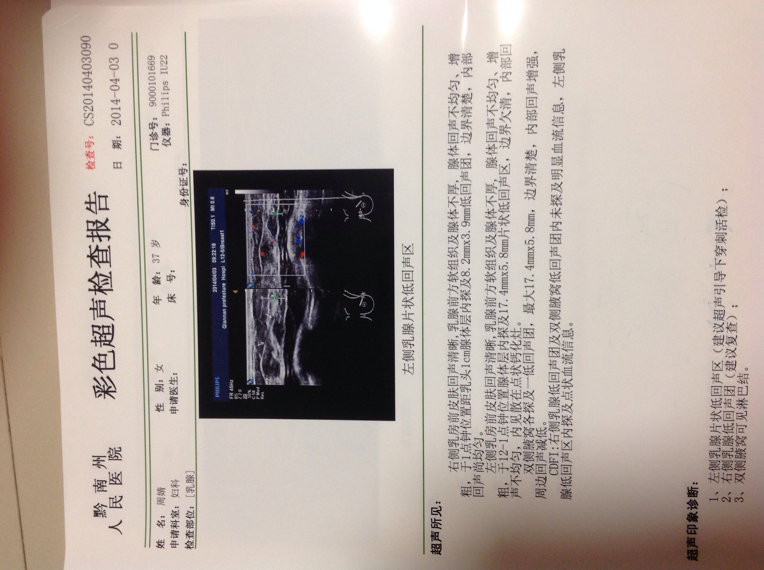 右侧乳房有偶然疼痛,做彩超如下图,已做活检但尚未得到结果,请问医生这会是乳腺癌吗?如果是,会是哪个 阶级?谢谢! 点击展开 匿名用户 2014-04-04 21:39 为您推荐: 其他回答 病情分析: 这种情况只有超声检查的结果不能确定具体的性质的。 指导意见: 建议等穿刺活检的病理检查结果出来才能确定是不是恶性的。如果是恶性的应该尽快手术治疗的。 匿名用户 2014-04-04 22:06 相关问题 村里普查乳房有硬块,大夫怀疑是乳腺癌,去医院做彩超就能诊断出来吗,大概多少钱?几年前手能摸出来有硬 乳头偶尔疼痛,其周围长小颗粒,偶尔有乳白色溢液,乳房内好像有肿块,请问是不是乳腺癌啊? 亲们为什么给小孩子喂奶乳房里面会有疙瘩一边一个疙瘩,有点疼痛 请问一下会不会是乳腺癌的症状呢???