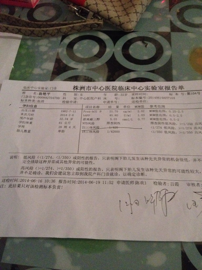 上星期一做完唐氏筛查,今天拿到结果,结果是这样的,是什么意思?医生说有一项21体高风险 上星期一做完唐氏筛查,今天拿到结果,结果是这样的,是什么意思?医生说有一项21体高风险 点击展开 158*****951 2014-06-23 18:41 为您推荐: 其他回答 1/420 ,一般不算是高风险。 乐观的JWL999 2014-06-25 19:42 唐筛结果,21三体风险为400多(看不清4后面的数值),风险不是太大不用着急,也可以做其他检查,排除胎儿疾病。 乐观的JWL999 2014-06-23 18:53 相关问题 上个礼拜做了唐氏筛查,医生打电话告诉我,是二什么综合体高风险,现在报告单也还没拿到,我到底该怎么办 今天拿到早期唐筛结果,21位综合体是高风险,后来做了无创dna 还在等结果,心里担心啊 求助:唐氏筛查21体结果是1:480,医生说是临界风险,是不是很严重啊?