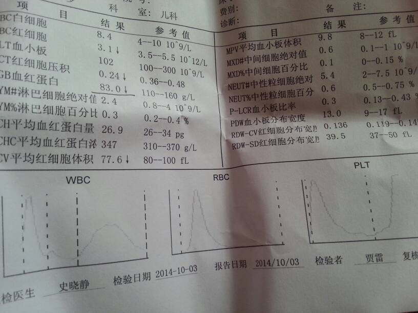 谁会看化验单啊?女儿三周岁了,连续几天每天晚上都发烧 谁会看化验单啊?女儿三周岁了,连续几天每天晚上都发烧。 点击展开 爱丶那么遥不可及 2014-10-03 09:11 为您推荐: 其他回答 这个血常规化验基本上还是正常的,考虑是病毒感染可能性更大一些 衷喜明2 2014-10-03 21:14 用酒给他推下 ≯Cool _ 2014-10-03 13:19 你的宝贝有点贫血,喝退烧药 若惜,一生相依。 2014-10-03 10:22 你应该给他去去惊,只有惊着的孩子才会反复的发烧 认认真真好好爱 2014-10-03 09:36 相关问题 5周岁小孩,反复发烧,血常规化验单,请帮看看 我女儿四周岁了,每天晚上睡觉的时候,在刚刚睡着一两个小时内,头上出汗很多 求助医生我女儿三周岁上学一个多月了最近老是反复发烧,有什么好办法治疗吗?怎么预防呢