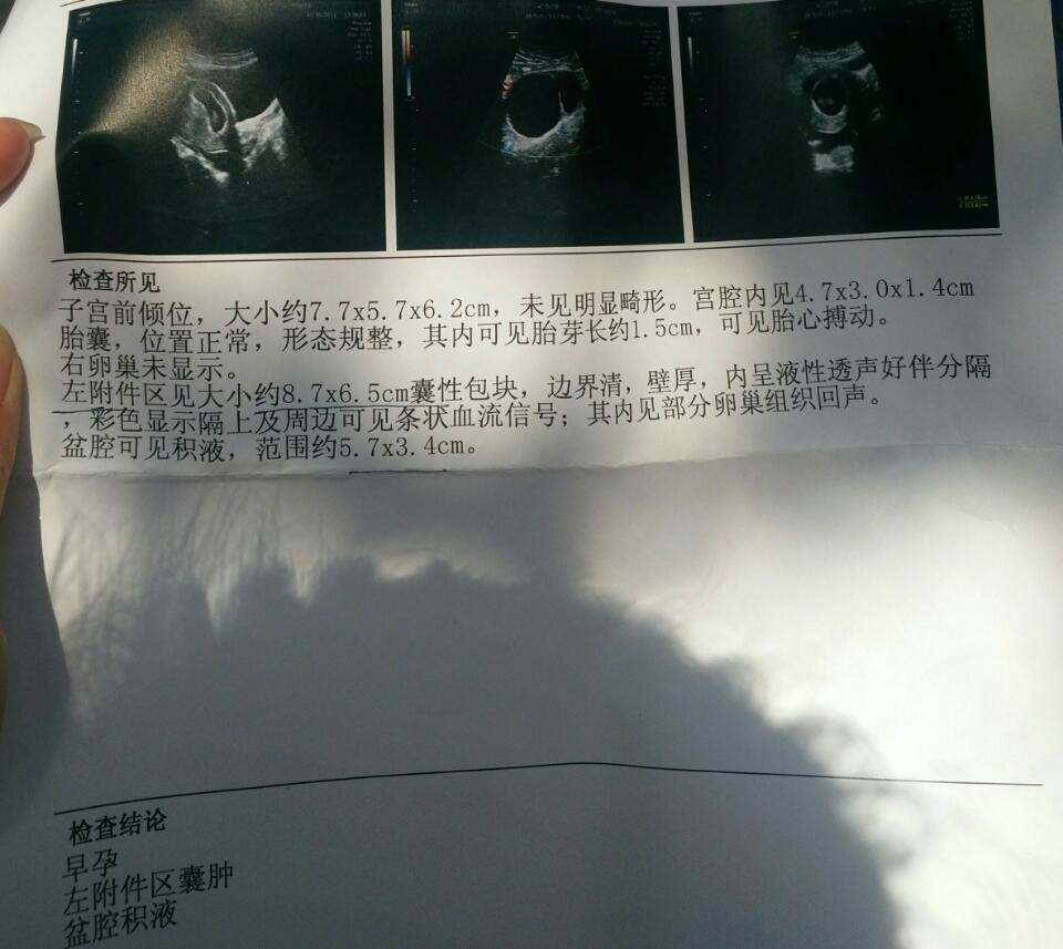 怀孕58天,左附件区有8.7-6.5cm大的囊肿包块,有条状血流信号,部分卵巢组织回声 盆腔可见5