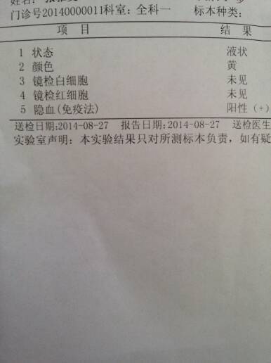 女宝宝,11个月,谁能帮我看看化验单是什么意思? 点击展开 小妖~~ 2014-08-27 13:10 为您推荐: 其他回答 你好,这个是大便常规的化验单,其中隐血为阳性,说明宝宝的大便里面有红细胞,大便潜血(亦称便隐血)是指消化道少量出血,红细胞被消化破坏,粪便外观无异常改变,肉眼和显微镜下均不能证实的出血。 hfh194 2014-08-27 17:37 相关问题 帮我看看化验单上是什么意思?宝宝的化验结果好不好? 谁能帮我看看这个孕酮的化验单,是什么意思? 请帮我看看这张白带化验单是什么意思???