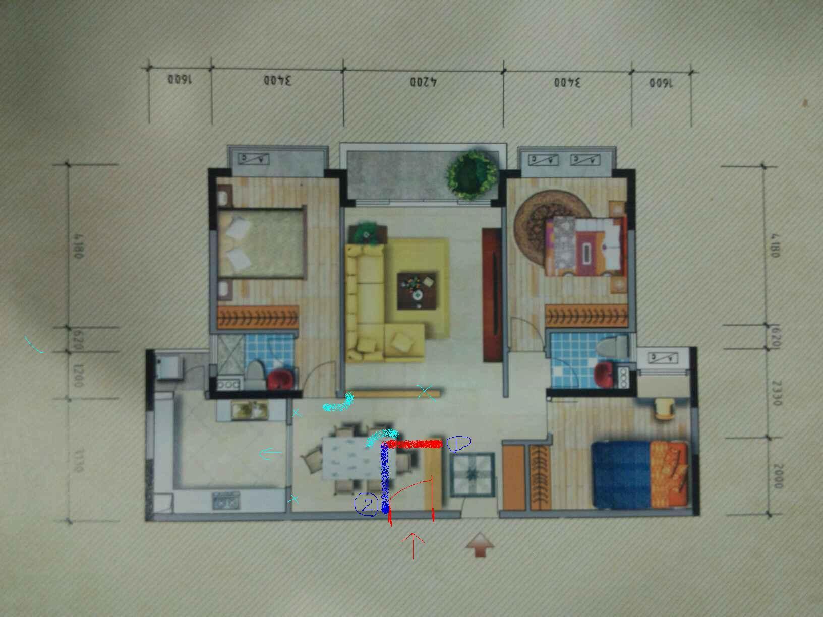 请教一下高人这个户型怎么改比较好?夫妻两个人住,还没有小孩,父母在外地。上南下北!室内墙壁全建好房子存在的问题有:进户门右手边就是隔壁的门,走道很窄两个门无法同时开,所以考虑把大门往左移,厨房的两堵小墙拆掉,是否可行?(红色部分开门)大门左移后准备在对面两米处做个玄关(红色粗线),请问应该是到顶的还是不到顶的好?做了玄关之后怎么化解跟卧室墙角相对的问题?(浅蓝色的两个角)房子基本上只靠一面采光,光线很暗,有没有什么改进的办法?客厅跟卧室中间的墙能不能作成上半部玻璃的?房子没有南北对流,所以空气很闷,怎样才能实现空气对流?生活阳台太小了有什么办法能充分利用起来吗?衣服只能晾在大阳台吗?问题有点多,小地方又没有专业的设计师,只能求助于网络,希望达人、大师、好人能给予解答~~万分感谢~··