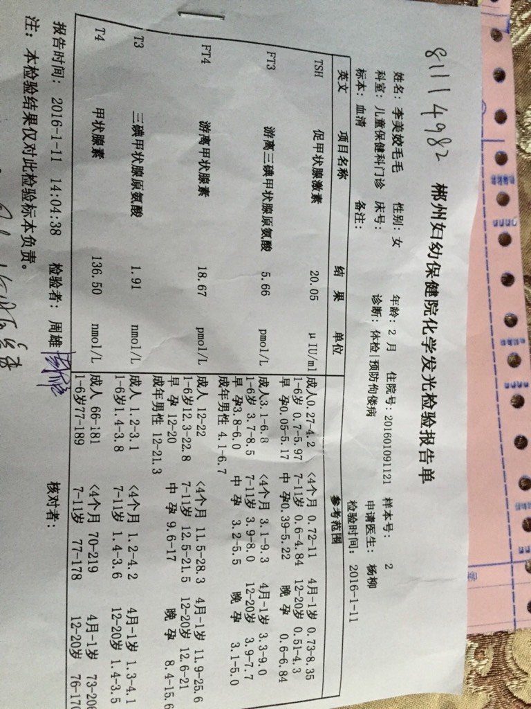宝宝2个月tsh高,Ft3,FT4,T3T4都正常,是甲减吗?第一次是验血是17,第二次验血是14 宝宝2个月tsh高,Ft3,FT4,T3T4都正常,是甲减吗?第一次是验血是17,第二次验血是14,第三次复查就变20了,好担心,这是甲减吗?听说甲减要一辈子都吃药,是吗?医生开了优甲乐,说每天吃五分之一,请各位医生大人帮我分析分析一下! 点击展开 Ababy7788 2016-01-12 21:45 为您推荐: 其他回答 可以这么理解 cn#BGVLVufkGL 2016-01-13 16:50 听医生的就好了 188*****873_x7yR 2016-01-12 22:38 应该没什么太大问题 常玉 2016-01-12 22:32 问医生,。 小甜甜妈咪。x 2016-01-12 22:10 建议吃段时间优甲乐后再复查,如果有效,就有可能存在 cn#BGVLVufkGL 2016-01-12 22:01 加载更多 相关问题 第一次去检查医生让我去抽血的、说还小B超做不出来、做B超对宝宝不好所以没做、所以我想问下第一次验血 医生你好,今天验血是病毒感染,17斤一岁的宝宝吃多少合适 17个月宝宝,一天大便两三次 早上第一次大便气味形状都很好 就是下午的一到两次大便会有酸臭味
