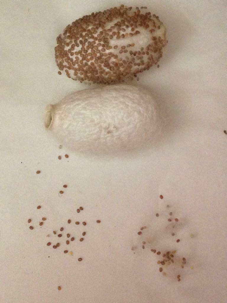 我开始别人给了两个蚕宝宝,出来,交配后生了卵,由于没时间管,茧一直放在盒子里,蛾就把卵下在了茧上