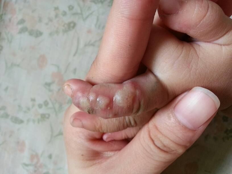 哪位来帮我看看、我女儿快十个月了、前些天手上出了一个水泡、就是图上已经破了的位置、以为是爬的时候磨