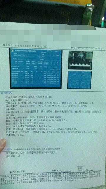 孕31周,做了彩超,医生没有说重量,请会看的帮忙看看宝宝多重了~谢谢 孕31周,做了彩超,医生没有说重量,请会看的帮忙看看宝宝多重了~谢谢 点击展开 134*****646 2014-11-23 22:19 为您推荐: 其他回答 祝宝妈好运哦 粉色高跟鞋的梦 2014-11-24 22:17 宝宝挺大的。 流年、在等谁的相儒以沫 2014-11-24 01:26 我有一个数据可以求出 立仔 2014-11-23 23:24 孕32周多的胎儿约2000克左右的重量,也就是4斤左右,这胎儿不算小的了。 彩色的风三 2014-11-23 22:42 相关问题 孕32周,去做彩超,宝宝的估计重量有6斤了… 孕10周了,B超查出来有胆结石,医生说不能吃油腻的东西 请问医生这样会会对我我的宝宝有影响吗?前天