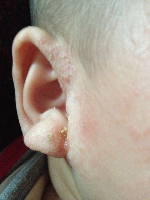 请问有医生在吗?有谁知道这是什么吗?宝宝快要四个月了,两边耳朵都这样,刚开始以为是湿诊,越来越严重