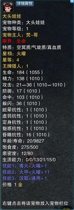 想洗个火宝宝PK用,还想省钱??? 别想了,那不可能滴。 虽说现在老区金价狂跌,豆子便宜多了,但想洗出个成品火宝宝,没有800RMB你就别想了。 我是按100RMB=20组豆子算的。火宝宝成品160-180组豆子消耗算是少了的。 别说什么别人卖的满攻火宝战否宝现在才300左右。 首先收成品本来就会便宜点,而且卖300的所谓成品,大小攻都洗限界满了吗?防御气血命中都洗限界满了吗?六技能等级洗到91了吗患锈? 火宝宝天生攻高防低血少,想要体现攻高,大小攻必需满,不想被随便来下就死,血防必需洗满,命中不够普攻打怪全是未命中,所以命中也得洗。 总结下来,火宝宝能成品那是极牛X的东西,但不能成品,那就是垃圾。挂机消耗大,PK随便下就梨哑点OVER了。 而且你这宝宝,先天技能数量不足,这是先天的,后期没法改的,所以扔了吧,没洗的必要。