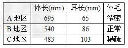 对分布在A\B\C三个地区的某种哺乳动物的测量结果如下表: 如果上述数据分别取自于云南的