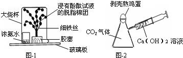 魔术一“奇花变色:酚酞遇碱性物质会变成红色,而浓氨水呈碱性,所以可观察到“铁树”上浸有无色酚酞试液的棉团由白色变为红色;“铁树”和浓氨水并没有接触,考虑到分子的性质和浓氨水的性质可以知院富道产生该现象的原因为:A、分子是不断运动的;C、浓氨水具有挥发性;D、氨气的水溶液显碱性;而选项B没有涉及到,故填B;魔术二“瓶吞鸡蛋”:二氧化碳可以与氢氧化钙溶液且露究反应,生成沉淀和水,从而使瓶内气压降低,小于大气压,大气压把鸡蛋压入;所以将注射器中氢氧化钙溶液注入瓶中,迷绣片刻后会看到鸡蛋被“吞”入瓶中,所发生的反应为二氧化碳和氢氧化钙的反应.故答案为:魔术一:红;B;魔术二:CO 2 +Ca(OH) 2 →CaCO 3 ↓+H 2 O
