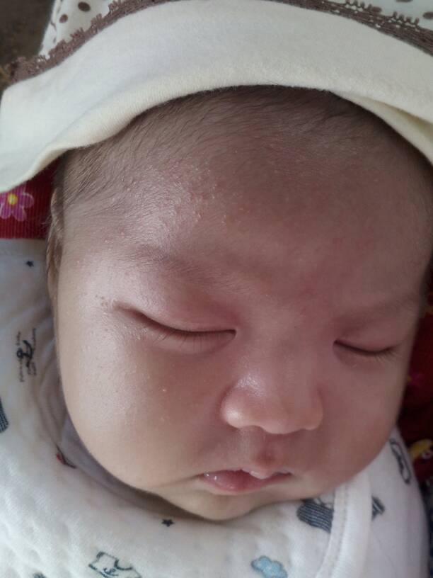 这个应该是婴儿湿疹.在6个月以内宝宝经常反复出现,可能是由于婴儿体内缺少某种抗体引起.建议,平时保持干净,干爽即可,不让奶水碰到.可以涂些宝宝湿疹膏,涂后很快会消失,但又很容易复发.