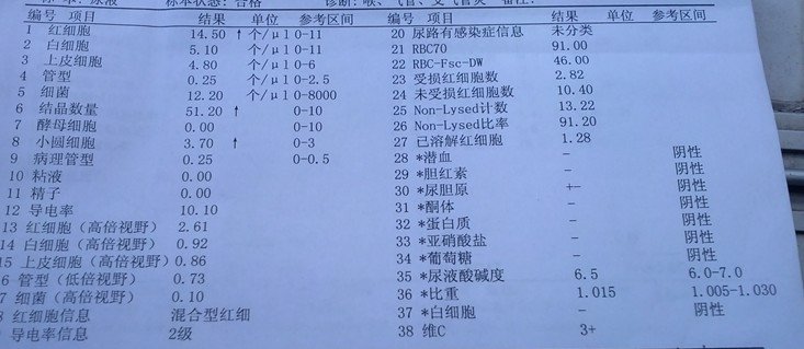 请专业的帮忙看看这张6个月宝宝的尿检单子,看有什么问题? 点击展开 匿名用户 2013-02-06 19:19 满意回答 可能一过性的血尿,如果复查还有的话建议查下肾功能 匿名用户 2013-02-06 20:33 宝宝知道提示您:回答为网友贡献,仅供参考。 相关问题 尿检没有怀孕,请问这张单子说明怀孕了没 早孕尿检报告单帮忙看看,医生说好像有问题 四年不孕,请医生帮忙看看我的检查结果正常吗?谢谢!我的主治医生说三张单子有一张结果有问题,给开了地