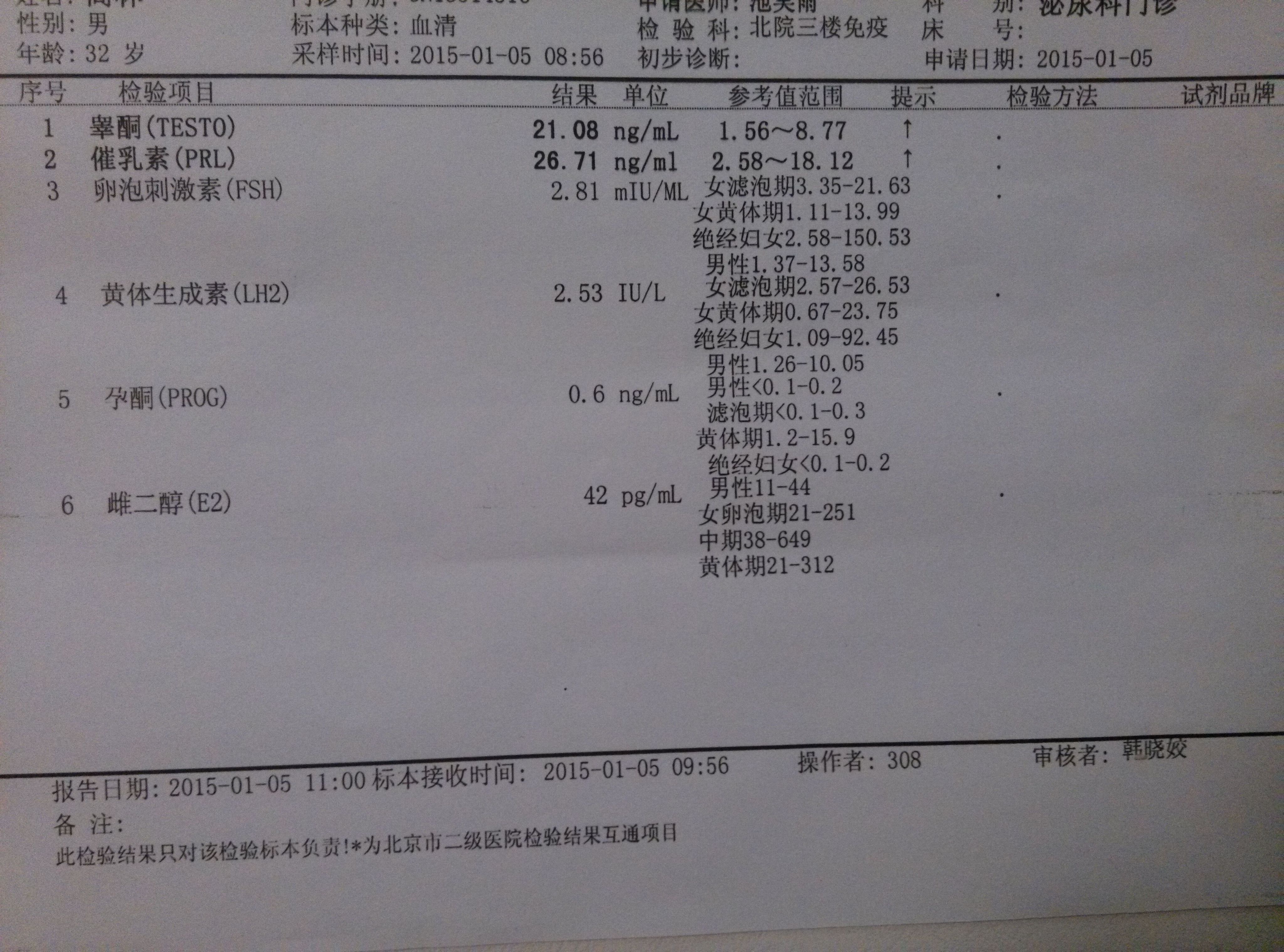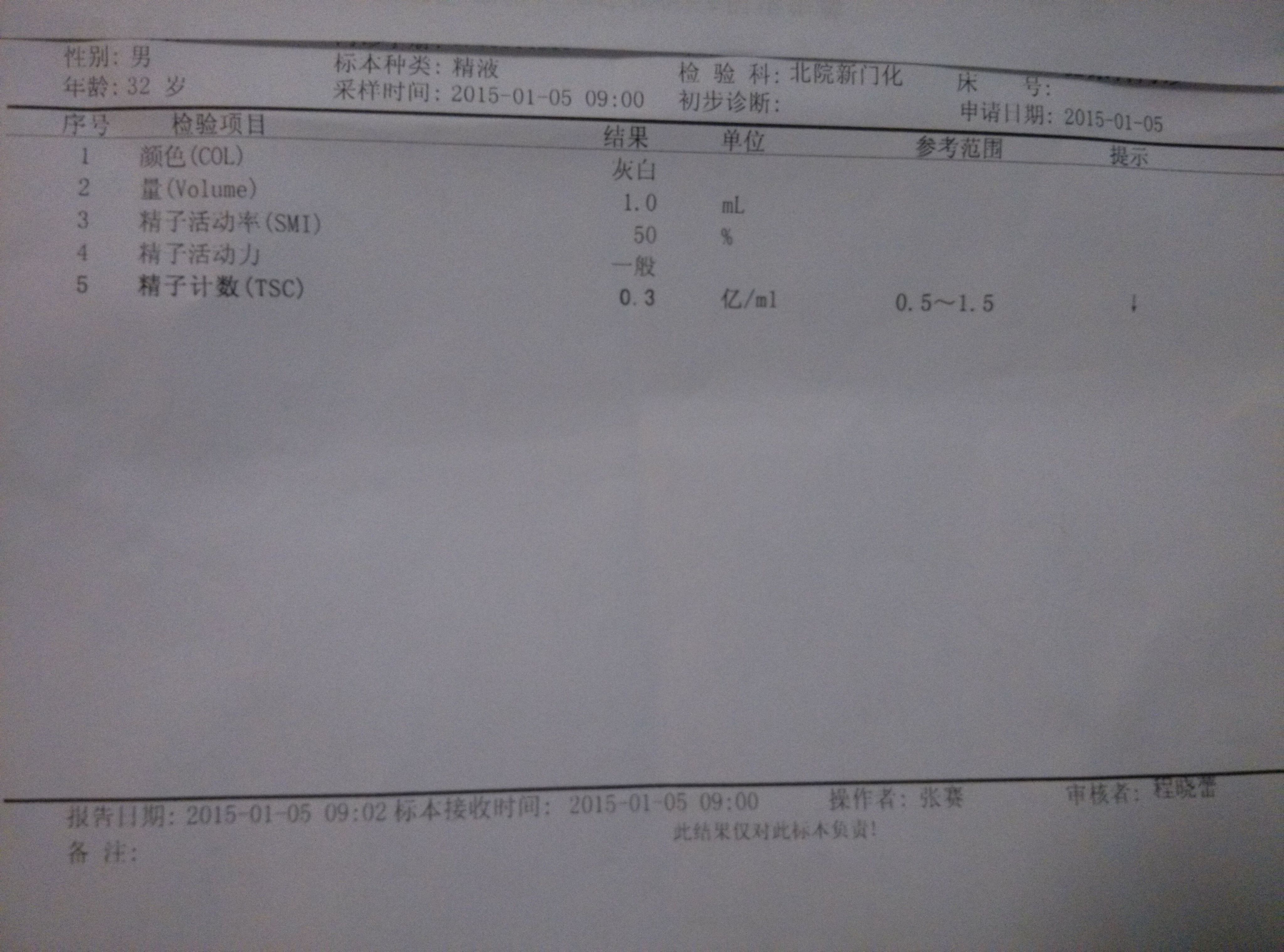 精液中0.3亿/ml\睾酮21.08ng/ml\催乳素26.71ng/ml,影响受孕吗?影响程度有多大? 以上检查结果影响受孕吗?影响程度有多大?如何补救?女性做孕前检查,要查哪几项,检查前应注意什么? 点击展开 匿名用户 2015-01-08 19:41 满意回答 精液检查有一定的标准,减乐最比如辉悼活力:一般A级精子要达到25%,A B>50%,等一些标准,但是这些指垃耻标只是一个参考 匿名用户 2015-01-08 21:32 宝宝知道提示您:回答为网友贡献,仅供参考。 相关问题 老公的精液检查,精子计数10 *10*6/ml 20>6/ml什么意思,容易受孕吗 服用甲睾酮片差不多一个月,出现精液减少,现已停药… 戴套ml,射精后不小心让部分精液漏进去了,受孕的机会有多大?