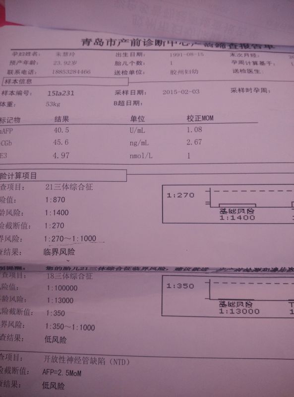 16周4天做的唐氏筛查21三体综合征风险值1:870筛查结果临界风险,真的挺担忧! 点击展开 匿名用户 2015-03-02 09:37 为您推荐: 其他回答 您好,根据您以上详细描述的,您目前的情况考虑应该是唐筛临界值,一般情况影响不大,畸形的几率不大,必要时可以羊水穿刺检查的 2015-03-02 10:16 相关问题 唐氏筛查,筛查项目:21三体综合征筛查结果:高风险 风险值:1/35 0 风 我是24岁,孕16周做的唐氏筛查,21三体综合征风险值是1:360,筛查结果是:临界风险有什么问 年龄25岁,十六周做唐氏筛查结果21三体综合征筛查结果低风险,风险值1:870正常吗?
