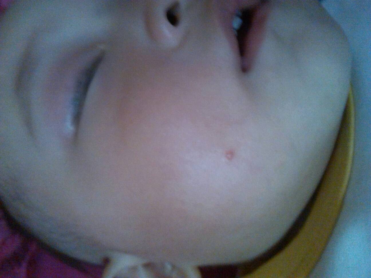你好,我家宝宝9个多月,八个月左右的时候晚上睡觉不知道被什么虫咬了,脸上红了一个包包,摸着硬硬的,去院弄了药说没什么,配了点擦的药,现在好了,可脸上现在都留着小印像痘痘,都一月了都没消下去,(附图片)跪求各位医生帮忙看看怎么弄了才会好?