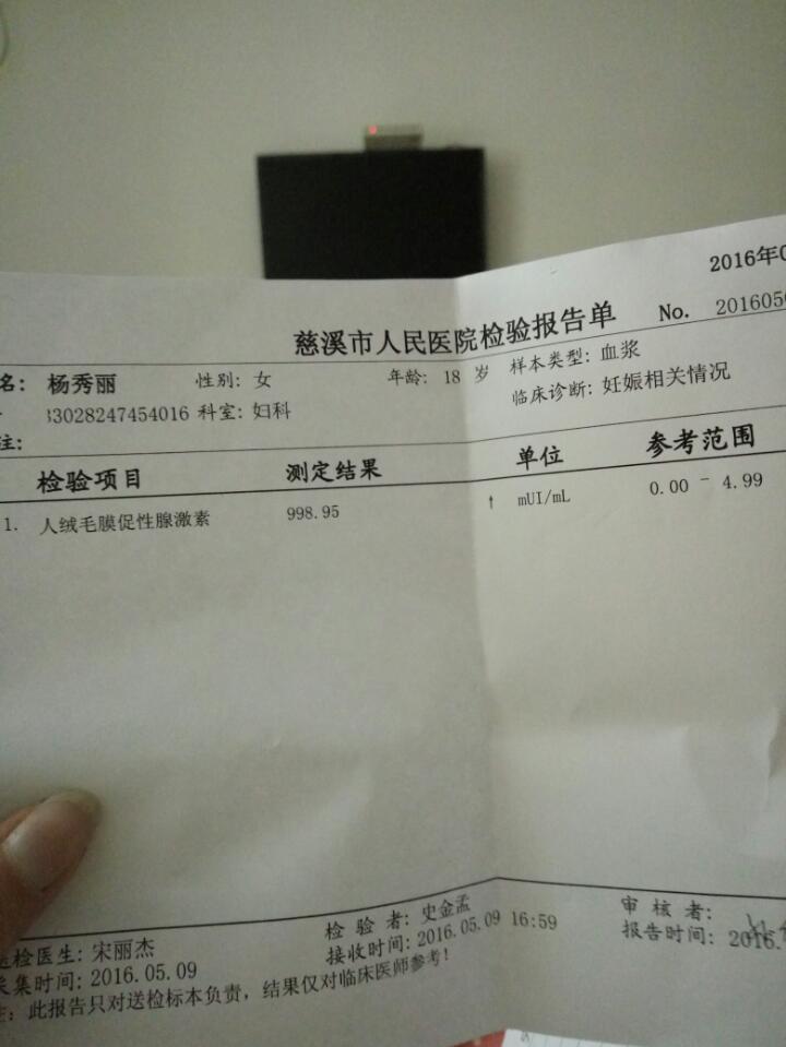 人绒毛膜促性腺激素测定结果998.95单位mUI/mL参考范围0.00-4.99是怀孕了嘛 人绒毛膜促性腺激素测定结果998.95单位mUI/mL参考范围0.00-4.99是怀孕了嘛 点击展开 激情后的陌生_vdfe 2016-05-10 16:57 为您推荐: 其他回答 你好,根据化验结果看数值是升高的,是确定怀孕了的,建议定期复查彩超。 cn#BkkGGQBppp 2016-05-10 19:57 相关问题 血清人绒毛膜促性腺激素测定(B一HCG)结果〈5、0,参考值〈20,单位MIU/mL是什么,是怀孕 人绒毛膜促性腺激素[HCG] 测定值116 82 单位mIU/mL 参考范围0-5 00是什么意思,是怀孕吗? 人绒毛膜促性腺激素测定结果为34123,单位mIU/mL,参考值