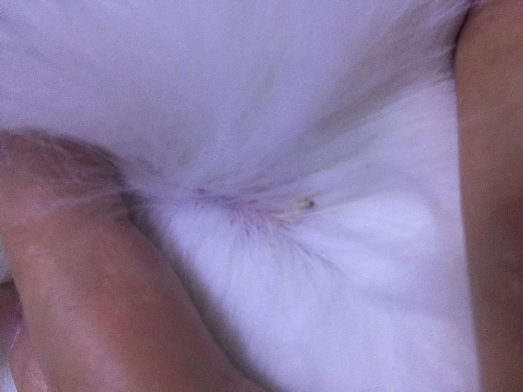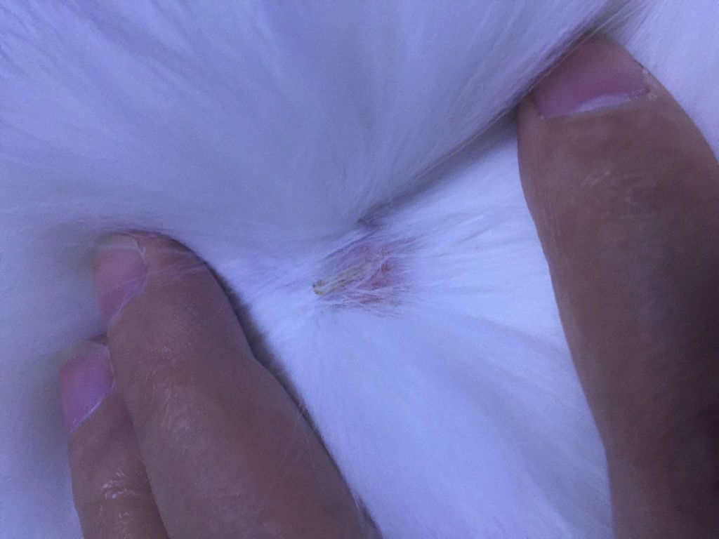 这个好想是截垃吊毛囊炎呀。,你挤一下,看是什么情况。丰躬如果是毛囊炎把东西挤出来。过段时间是会呈基自己愈合的。如果是藓的话是会出现皮屑的。藓就要去兽医那买药擦了、