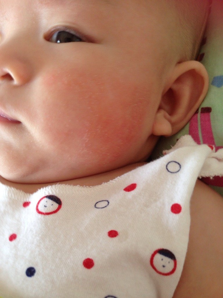 请帮我看看宝宝脸上是什么啊,是湿疹吗?我用清水洗完搽干,好像有流黄水,怎么回事啊!
