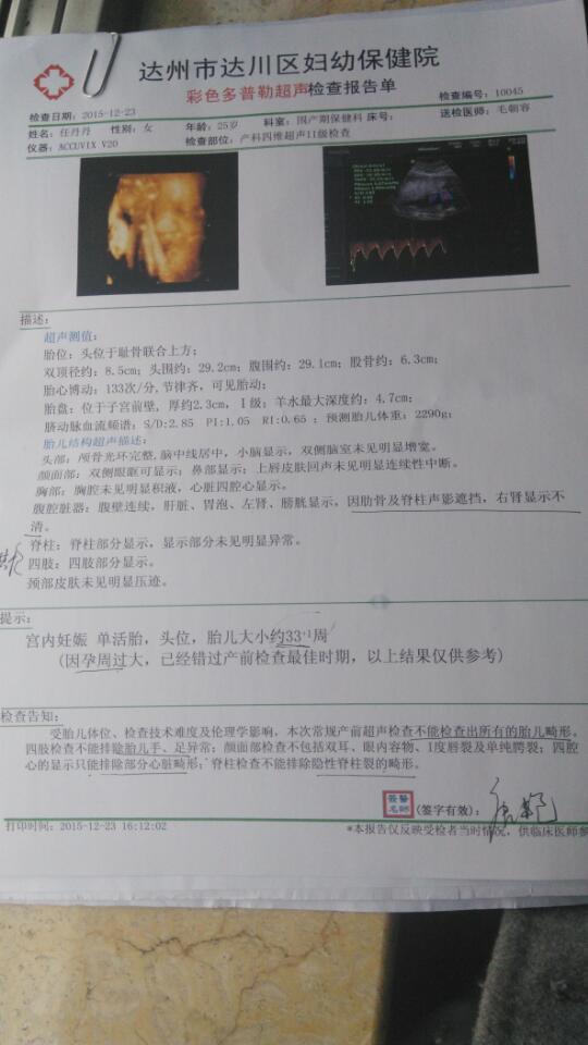 谁会看四维单子 求解,怀孕33周右肾看不清 谁会看四维单子。求解,怀孕33周右肾看不清 点击展开 惊 梦* 2015-12-23 18:02 为您推荐: 其他回答 不知道呢! 小河花🌹 2015-12-25 19:07 医生没说吗 宋宇涵妈咪 2015-12-23 19:45 你好,因为你现在怀孕时间比较长的关系,胎儿比较大了,因为胎位的问题,可能是会出现先生不清楚的情况,不一定是有问题的,你可以等孩子出生之后再复查看看有没有问题 ˿5784 2015-12-23 18:04 相关问题 23周四维彩超胎儿左右肾孟均宽0 7,25周右肾0 7左肾0 4 27周左肾0 7右肾0 8是不是慢慢变大了啊 怀孕八个月,去医院检查单子上写着因胎位关系胎儿面部结构看不清,但医生说没什么事,我担心胎位不正 怀孕33周,昨天去做检查胎心150次/分钟,没有做四维彩超,医生说让我注意胎动,但是,白天不怎么动