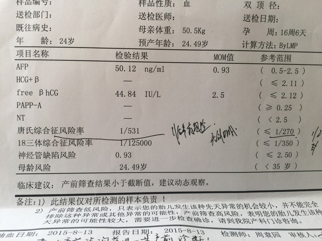唐氏综合症风险率1:531属于高风险吗?医生让我做血无创DNA我要做吗?18三体综合症风险率是1: 唐氏综合症风险率1:531属于高风险吗?医生让我做血无创DNA我要做吗?18三体综合症风险率是1:125000。但是参考值是小于等于1:350。我这个高出这么多正常吗? 点击展开 pipi3034 2015-08-15 15:46 为您推荐: 其他回答 听医生的吧 一一ss 2015-08-15 19:31 不懂,,, 150*****425_njXR 2015-08-15 19:18 不是很清楚哦 一号心如止水 2015-08-15 17:52 话说我就怕这种说不清道不明的情况!一开始直接就做准确率高的!你为了孩子做无创吧 巧克力大奶糖 2015-08-15 17:49 做吧!!!! 139*****084_NqY3 2015-08-15 17:18 加载更多 相关问题 今天唐氏筛查结果出来了,21三体综合症风险值1:23高风险 18三体综合症风险值1:2457低风险 吓哭了,这个结果是要做羊水穿刺呢?还是做无创DNA? 医生建议我需要做无痛DNA,唐筛检查我是高风险,是什么原因会引起21-三体综合症呢?求解 21三体综合症是1:64高风险医生叫我做DNA 宝宝知道