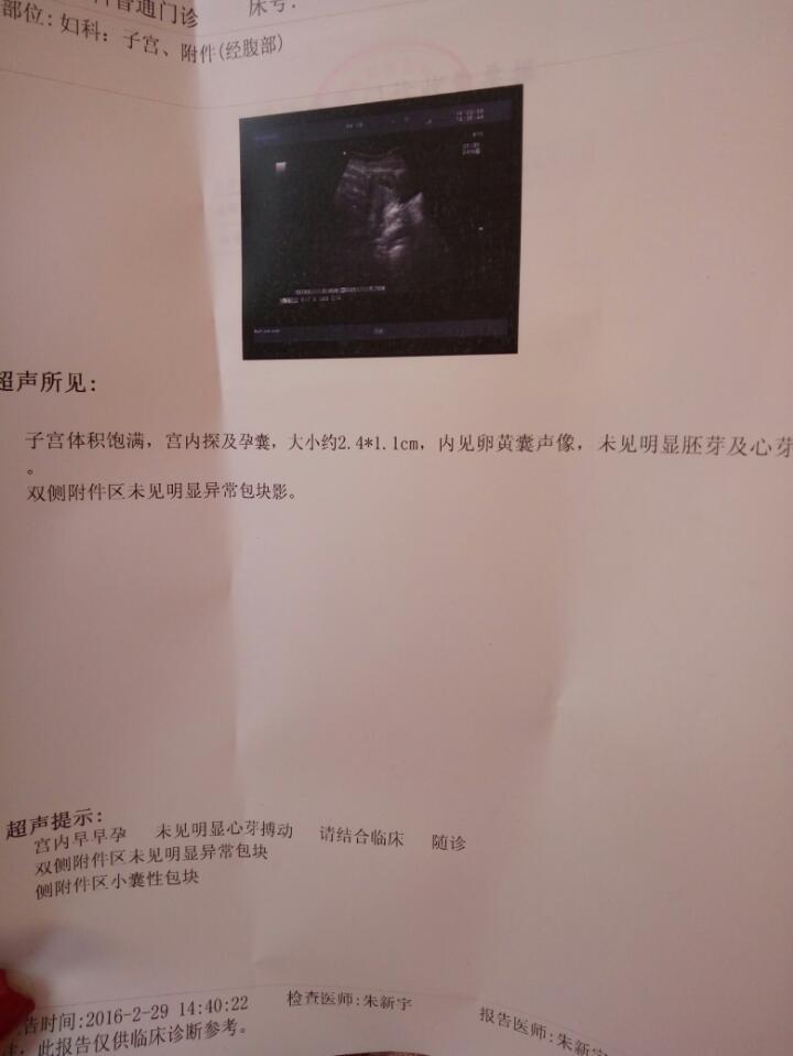 41 天怀孕超声所见,子宫体积饱满,宫内探及孕囊,大小约2.4*1.1cm,内见卵黄囊声像,未见明