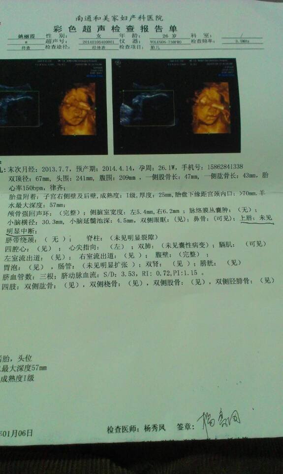 怀孕6个月做了四维彩超,医生说好的,我看着图像感觉像兔唇,可以帮我看看吗? 点击展开 匿名用户 2014-01-06 23:24 为您推荐: 其他回答 病情分析: 你好,不必担心,其应可以排除唇腭裂的。 指导意见: 保证充足的能量,增加鱼,肉,蛋,奶的摄入.注意做好孕检即可. 独水凡_xjeq 2014-01-07 04:51 相关问题 怀孕六个月昨天做四维彩超检查觉得宝宝的嘴好像不对劲 谁懂这个能帮我看看吗不会是兔唇吧 怀孕前一个月吃过金毓婷,做过了唐筛和四维,医生说好着呢,请问对宝宝以后会不会有影响,会不会有智力问 今天跟朋友聊天 朋友说 怀孕期间爱哭,爱生气,孩子会是兔唇,请问医生是真的吗?