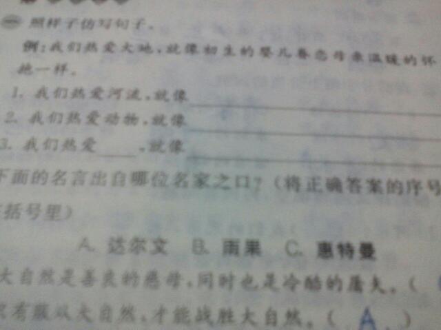 例:我们热爱大地,就像初生的婴儿眷恋母亲温暖的怀抱一样 1.我们热爱河流,就像( 例:我们热爱大地,就像初生的婴儿眷恋母亲温暖的怀抱一样。1.我们热爱河流,就像( )。2.我们热爱动物,就像( )。3.我们热爱(),就像( )。 点击展开 匿名用户 2014-11-11 17:36 为您推荐: 其他回答 祖国,,生命 匿名用户 2014-11-11 17:36 相关问题 我们热爱大地,像初生的婴儿眷恋母亲温暖的怀抱一样 仿句:我们热爱河流 例:我们热爱大地,就像初生的婴儿眷念母亲温暖的怀抱一样,我们热爱河流,就像?动物? 例句;我们热死大地,就像初生的婴儿眷恋母亲温暖的怀抱一样 我们热爱河流,就像 我们热爱