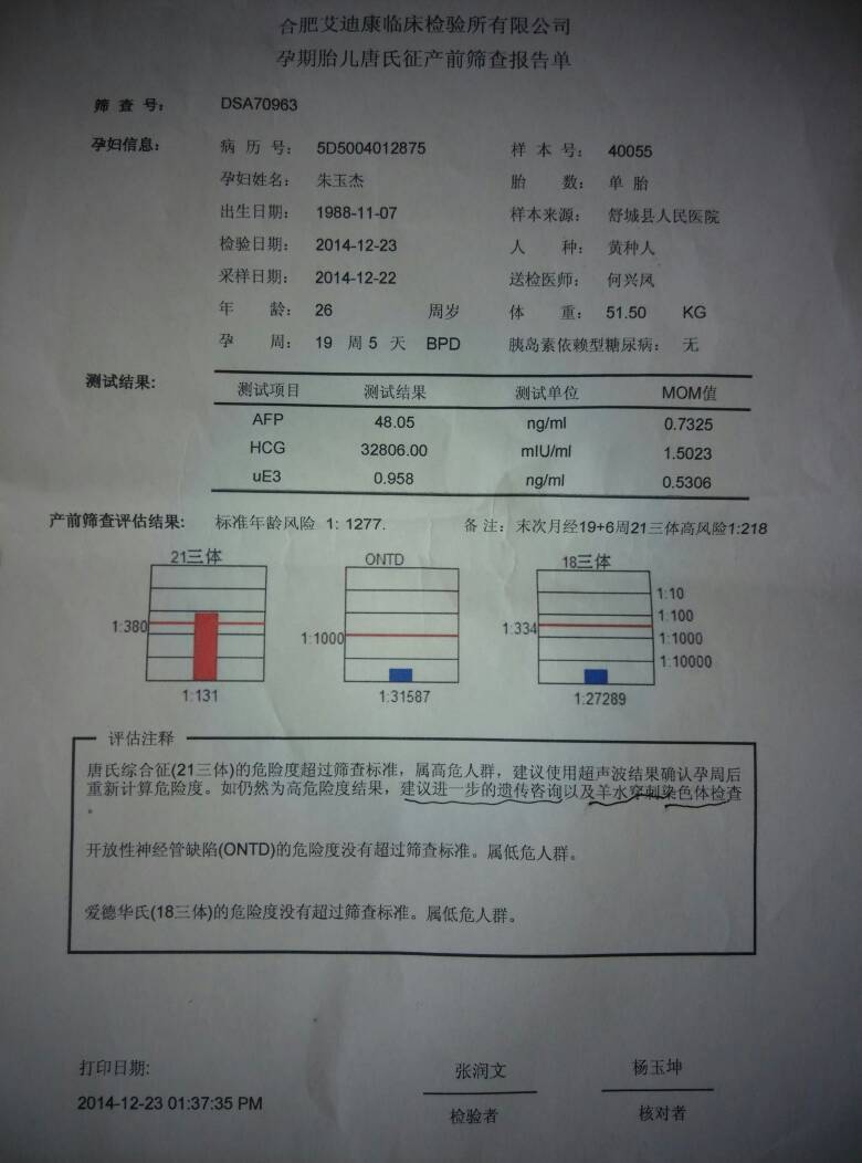 现在怀孕马上5个月了,上个礼拜去舒城人民医院做唐氏筛查检查,今天去拿报告,医生看了报告单后说21三体超正常范围,畸形的可能性很大,让我去合肥医院做羊水穿刺染色体检查确认一下。我有合肥一个医院医生的电话(下个月在这家医院做四维彩超),把情况跟她说了后,她说这种情况很多不用担心。可是我心里很矛盾,不知道要不要去做。希望大家帮我看看,谢谢。
